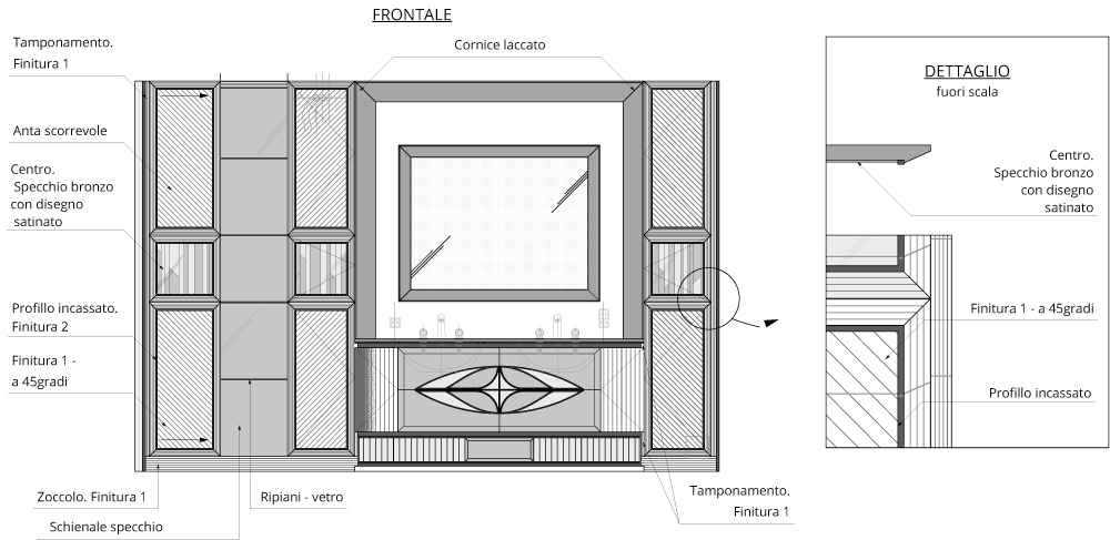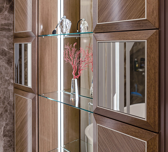 Для основного простенка в ванной комнате была разработана встроенная стеновая композиция, состоящая из пеналов с распашными и сдвижной дверцами и центрального комода со встроенными раковинами.