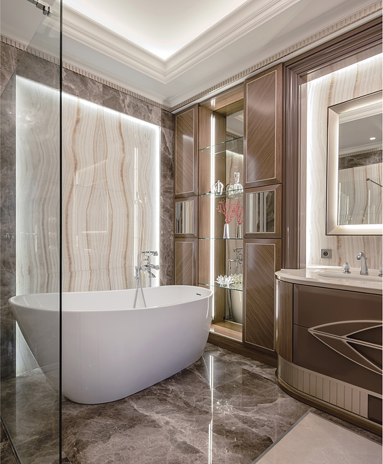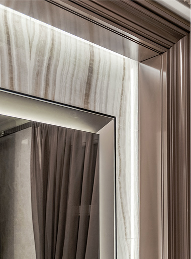 Широкий резной лакированный карниз с подсветкой по периметру оформляет простенок, облицованный натуральным ониксом.