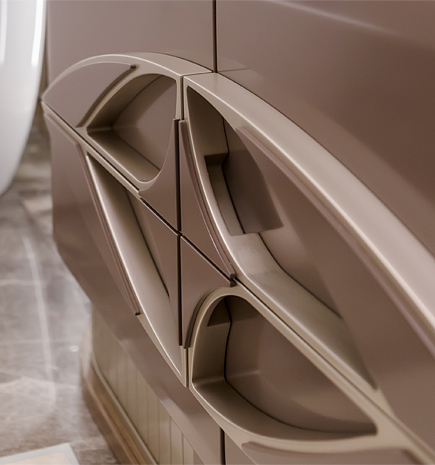 Доминирующим акцентом композиции стали декоративные ручки в разработанная в стиле Ар-деко, и выполненная в отделке из двух видов лака.