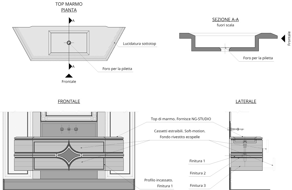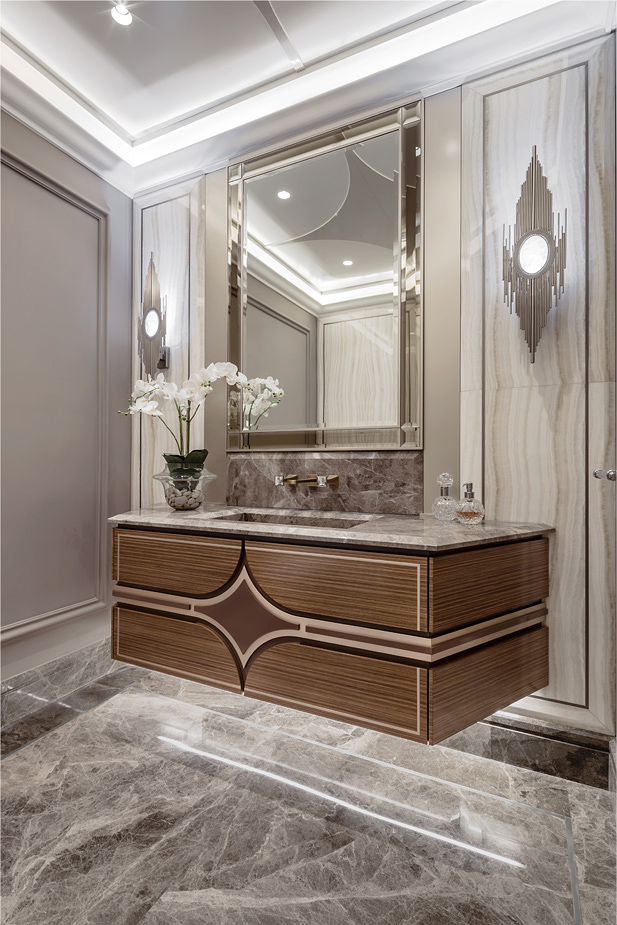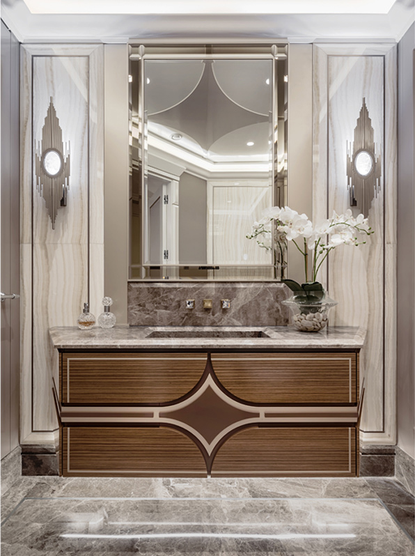 Подвесная мебель с раковиной обладает характерными для Ар-деко элементами - хорошо читаемая геометричная форма, детальная проработка и благородные материалы в отделке, а центральная фрезерованная ручка усиливает декоративность данной композиции.