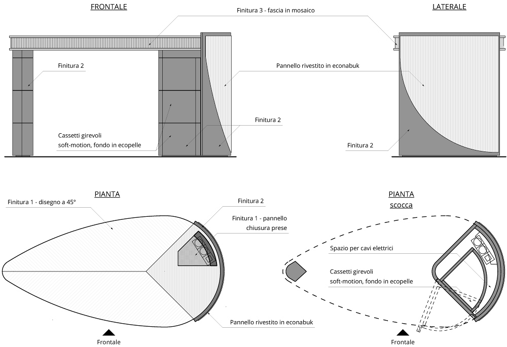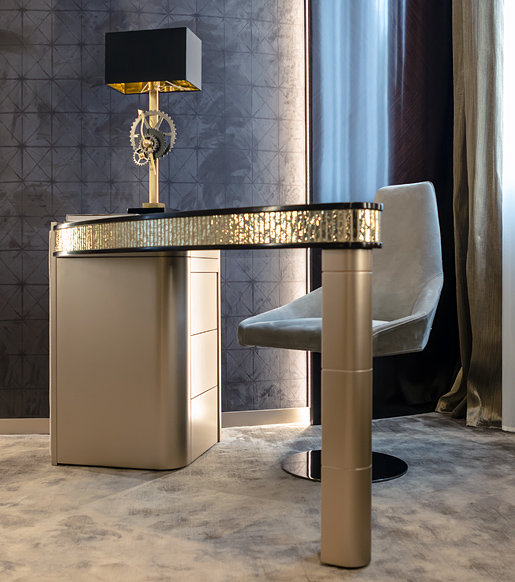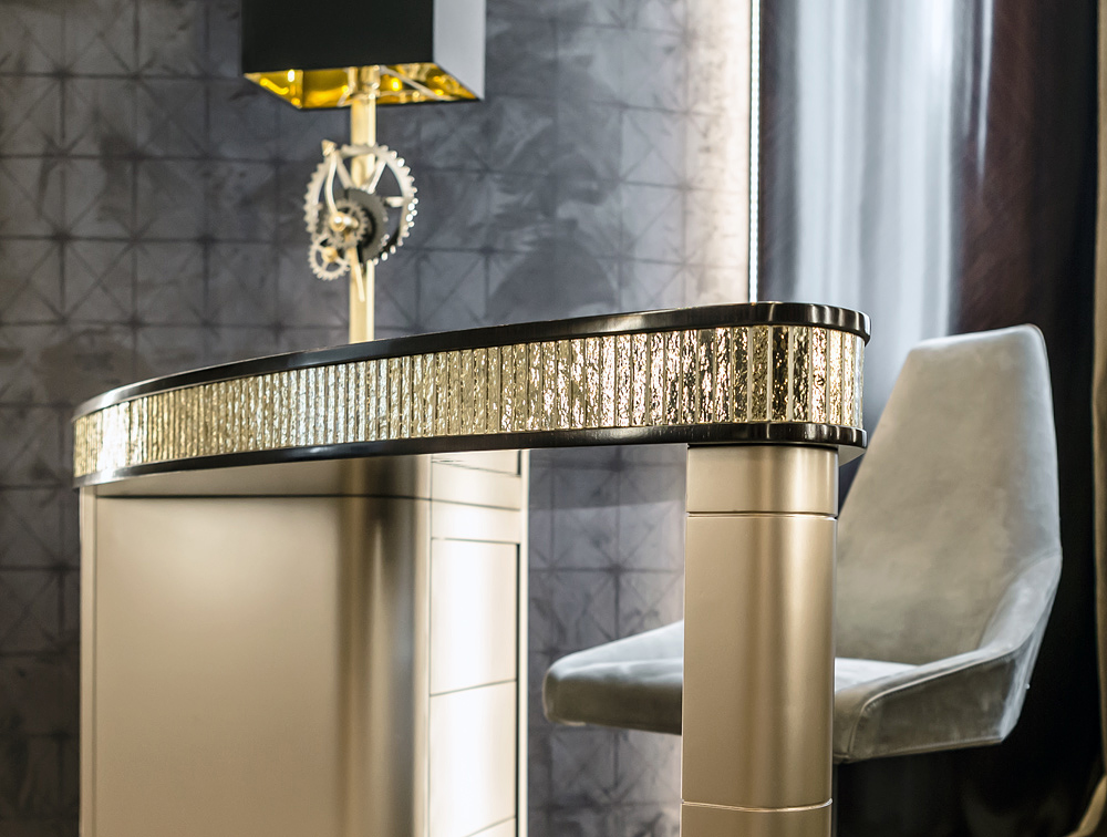 Декоративная вставка из мозаики муранского стекла подчеркивает форму столешницы в отделке шпоном венге. База с выдвижными ящиками в отделке лаком champagne деликатно сочетается с фронтальной панелью в отделке замшевой тканью с вертикальной прошивкой.