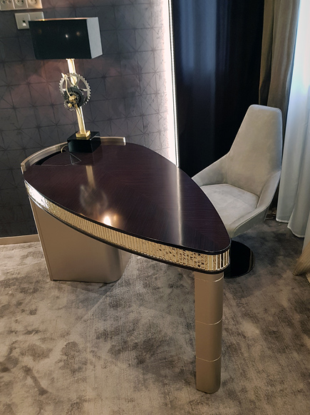 Элегантность и сдержанная роскошь характеризуют этот письменный стол, который благодаря своей форме, великолепно вписывается в небольшой по площади кабинет и сочетает в себе дизайн и функциональность.