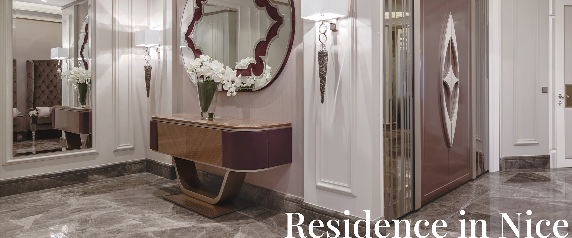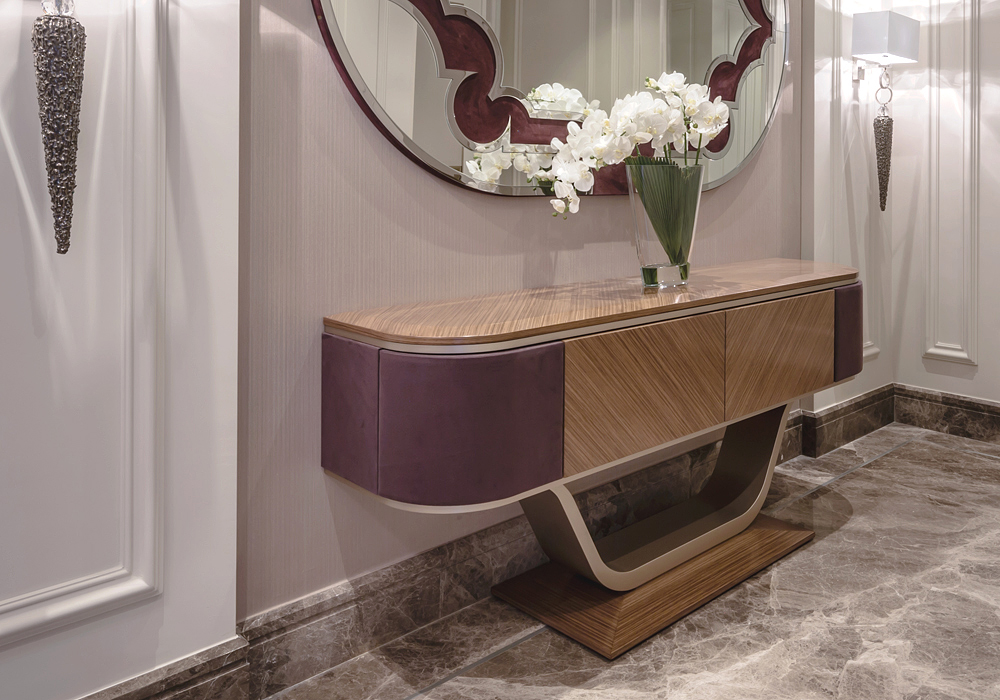 Элегантная форма этой консоли, сочетающая в себе эстетику и функциональность, сделала данный предмет мебели востребованным во многих наших проектах. Использование в отделке таких материалов как шпон ореха, натуральный нубук сливового оттенка и металлизированный лак champagne поддерживает цветовое решение всего интерьера, сочетающего в себе эклектику с элементами Ар-деко.