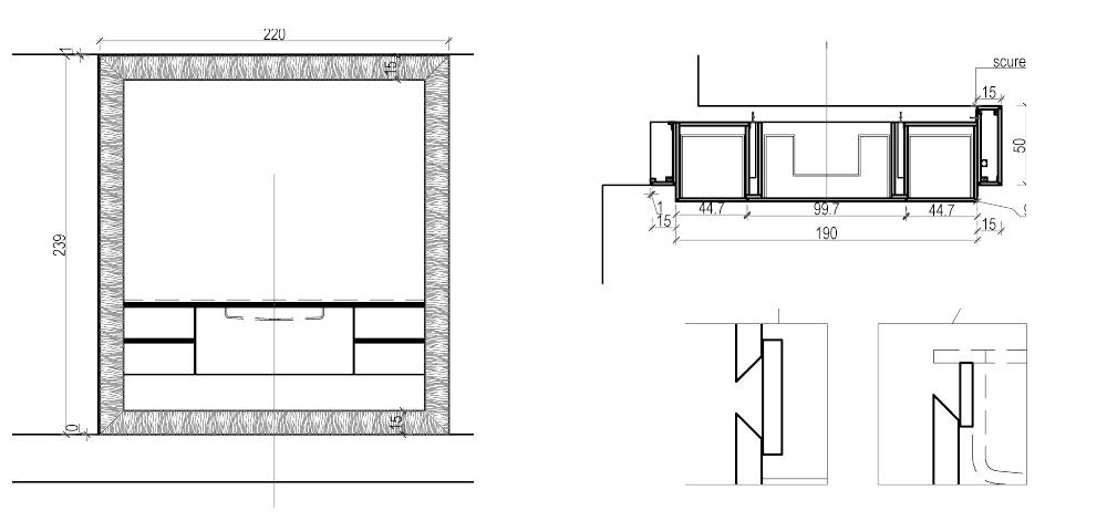 Широкая рама по периметру в отделке шпоном ореха формирует композицию и подчеркивает ее геометричность. Композицию дополняют подвесные пеналы, выполненные в тех же фактурах.