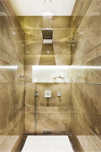 Центральный элемент ванной комнаты представляет собой отдельностоящую конструкцию со встроенной раковиной, ящиками и зеркалом с подсветкой. Эта конструкция функционально разбивает пространство, формируя просторную душевую зону сзади.