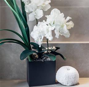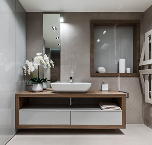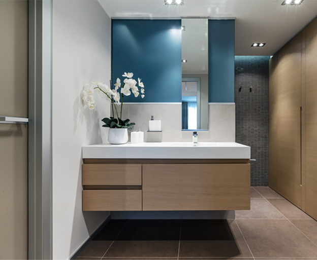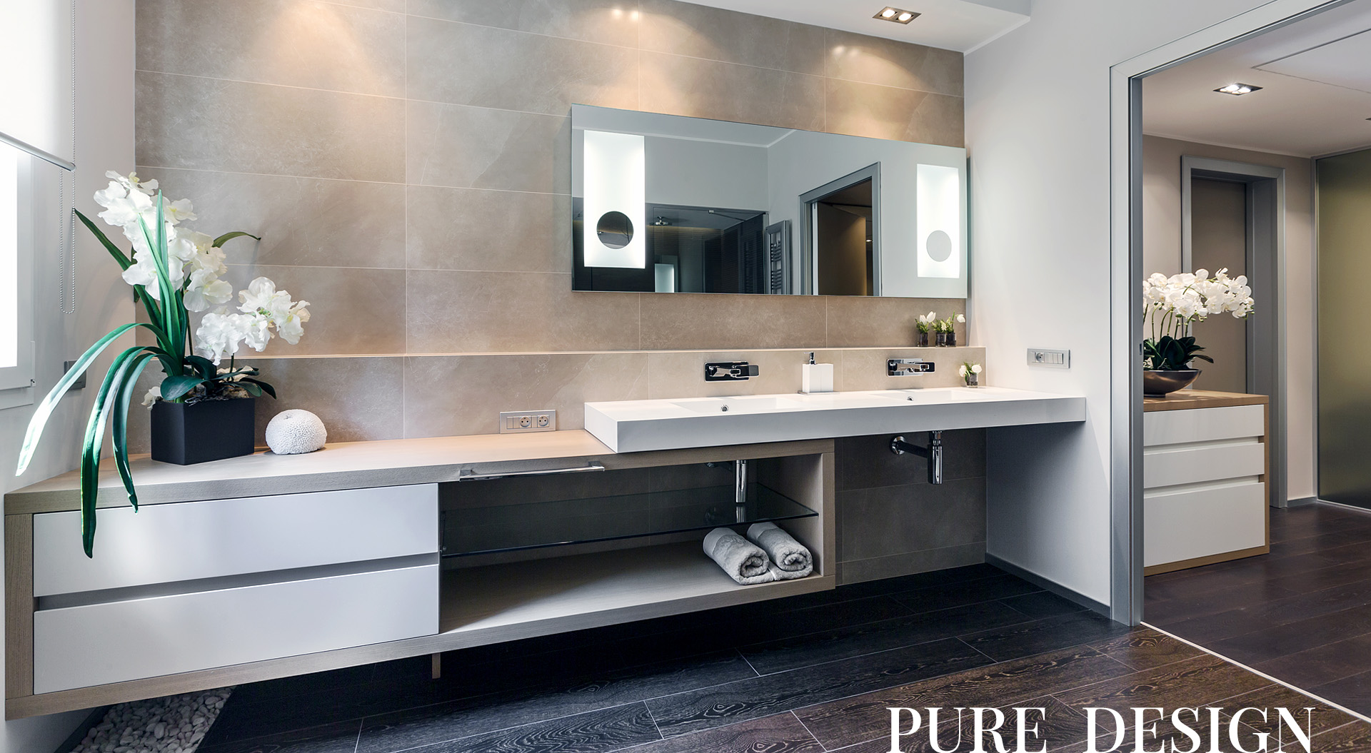 Раковины Antonio Lupi встроены в столешницу из кориана, внизу которой находятся секции для хранения банных принадлежностей.