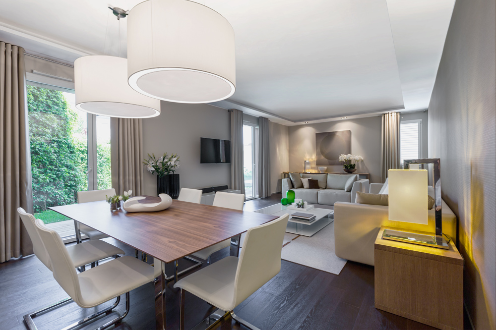 Общая зона гостиной, столовой и кухни представляет собой просторное и логичное пространство, в котором отдельные помещения плавно перетекают друг в друга.
