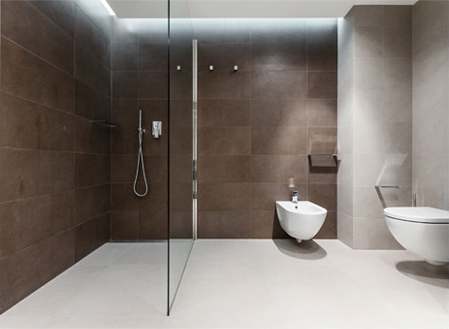Душевая зона устроена с помощью трапа в стене и выделена большим стеклом.