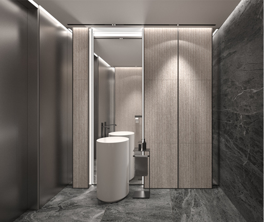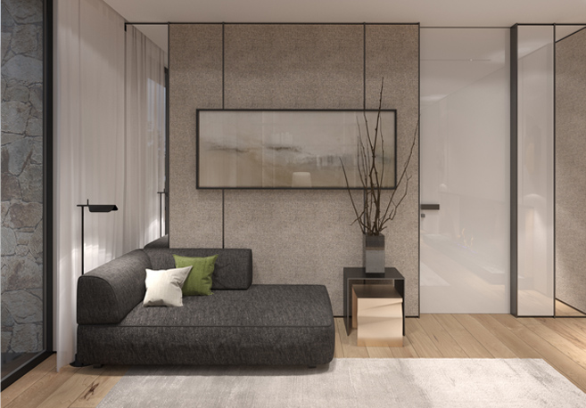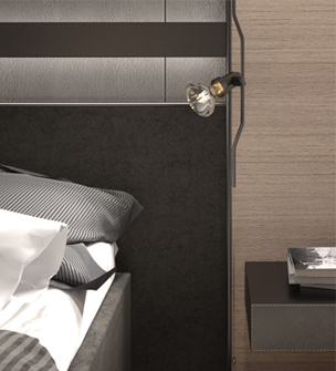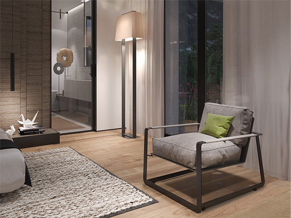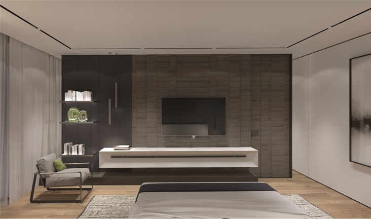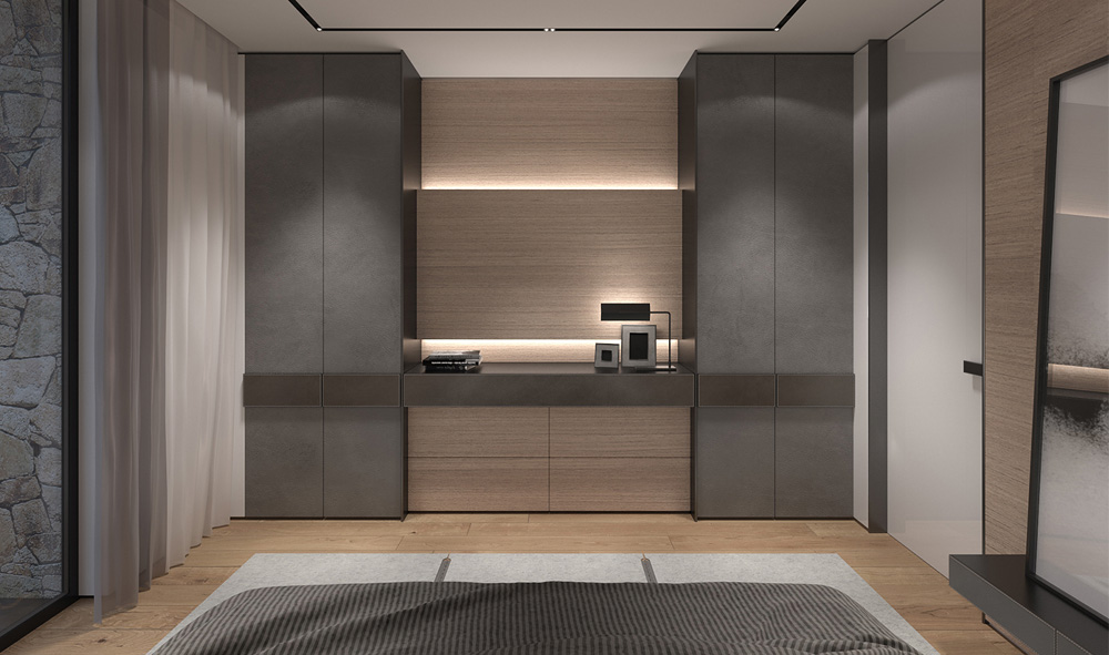 Гостевая комната решена минималистично на принципе интегрирования мебели во внутреннюю архитектуру. Сочетание теплых оттенков шпона с фактурой натуральной кожи и темного металла в отделке стен и мебели объединило все элементы и придало некоторую камерность небольшой по площади комнате.