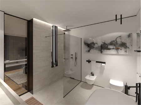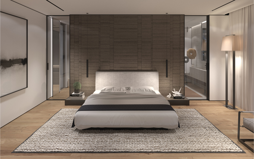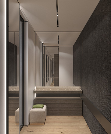 Монохромный интерьер спальни и гардеробной основан на сочетании контрастных фактур - крупная вязка шерстяного ковра, текстурная ткань в отделке гардеробной, гладкая фактура крашенного металла и лакированных поверхностей консоли.