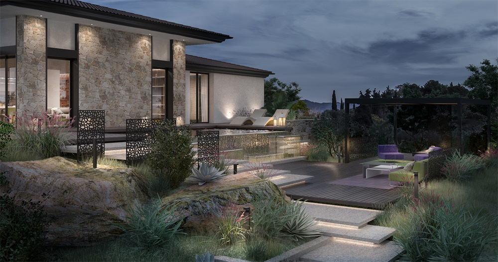 - террасирование участка позволяет выделить отдельные функциональные зоны, которые привносят в проект особенный образ. В итоге получился интересный и многослойный проект, в котором гармонично сочетаются традиции и современность.