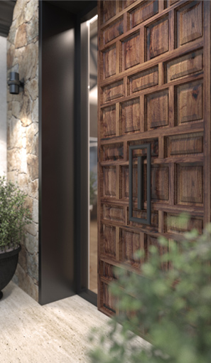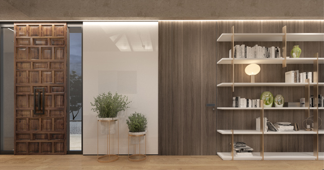 Например, входная дверь с грубой и состаренной фактурой сочетается с боковыми стеклянными фрамугами в отделке металлом цвета графит и глянцевой поверхностью стеновой панели.