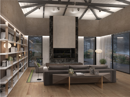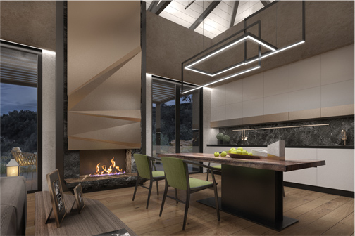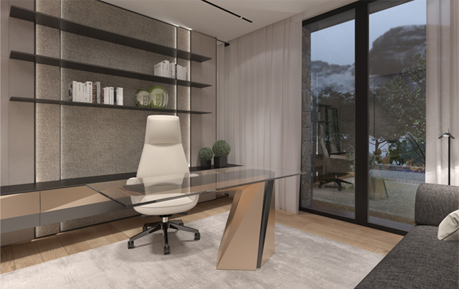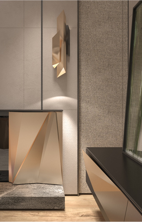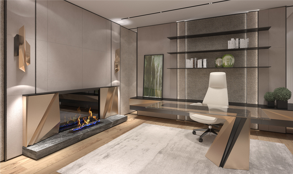 Рабочий стол футуристического дизайна с ломаной конфигурацией изножья, оформление простенка камина и настенные светильники, дизайн которых повторяет ломанные формы - все эти акцентные элементы, создающие интерьер, были специально разработаны NG-STUDIO.