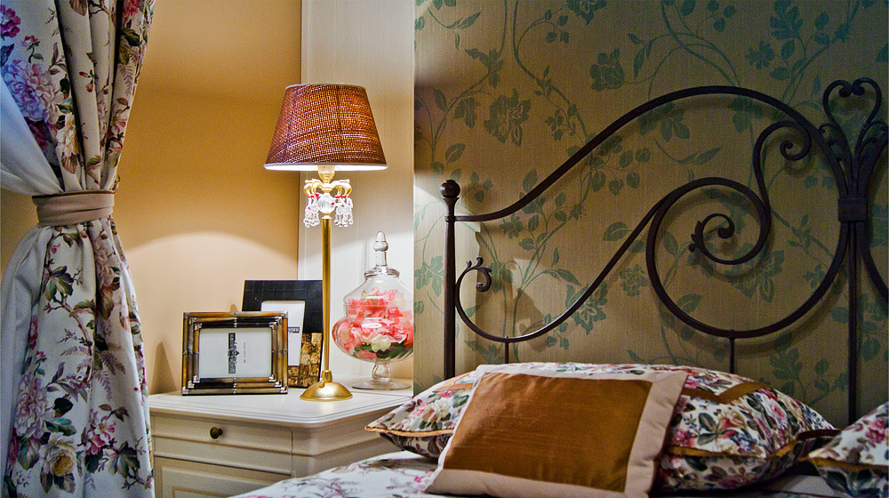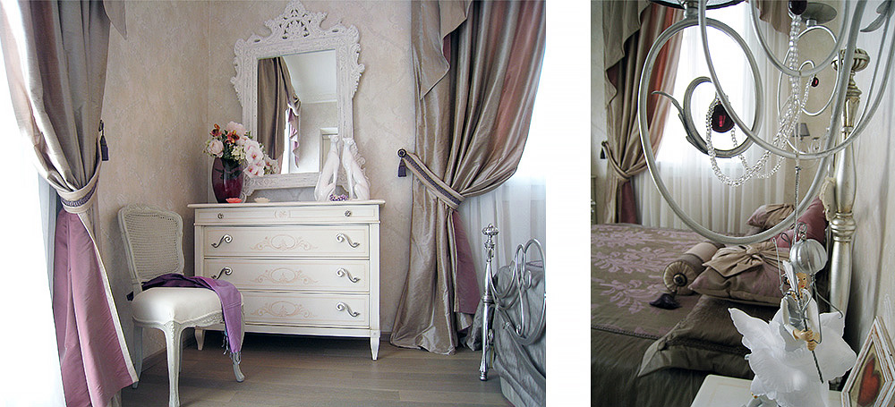 Мебель в традиционной отделке двумя оттенками лака, нанесенного вручную, декоративные вставки и гармонично подобранный текстиль создают яркий свежий образ, придавая интерьеру небольшой спальной комнате особое очарование.