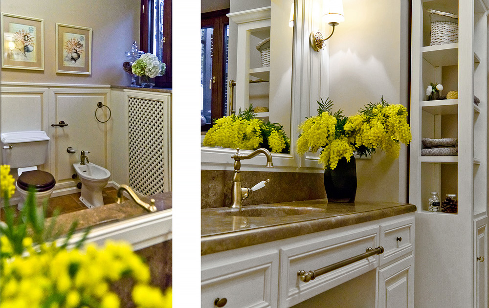 с мрамором Rosa Verona в столешнице и бронзовой фурнитурой создает светлый и мягкий образ, наполненный милыми деталями.
